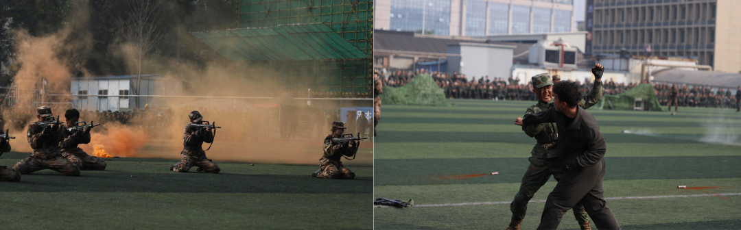 格斗拳术,摔打夺刀;匕首操演,锋芒凛冽;刺杀对抗,棍棒相撞;警棍盾牌,铿锵有力。由6名退役复学大学生和2024级新生组成的战术突击、防暴救护演练科目,更是将现场气氛推向了高潮。
